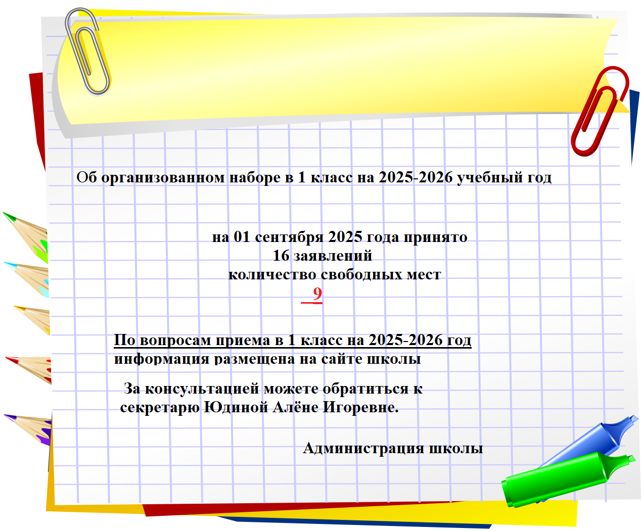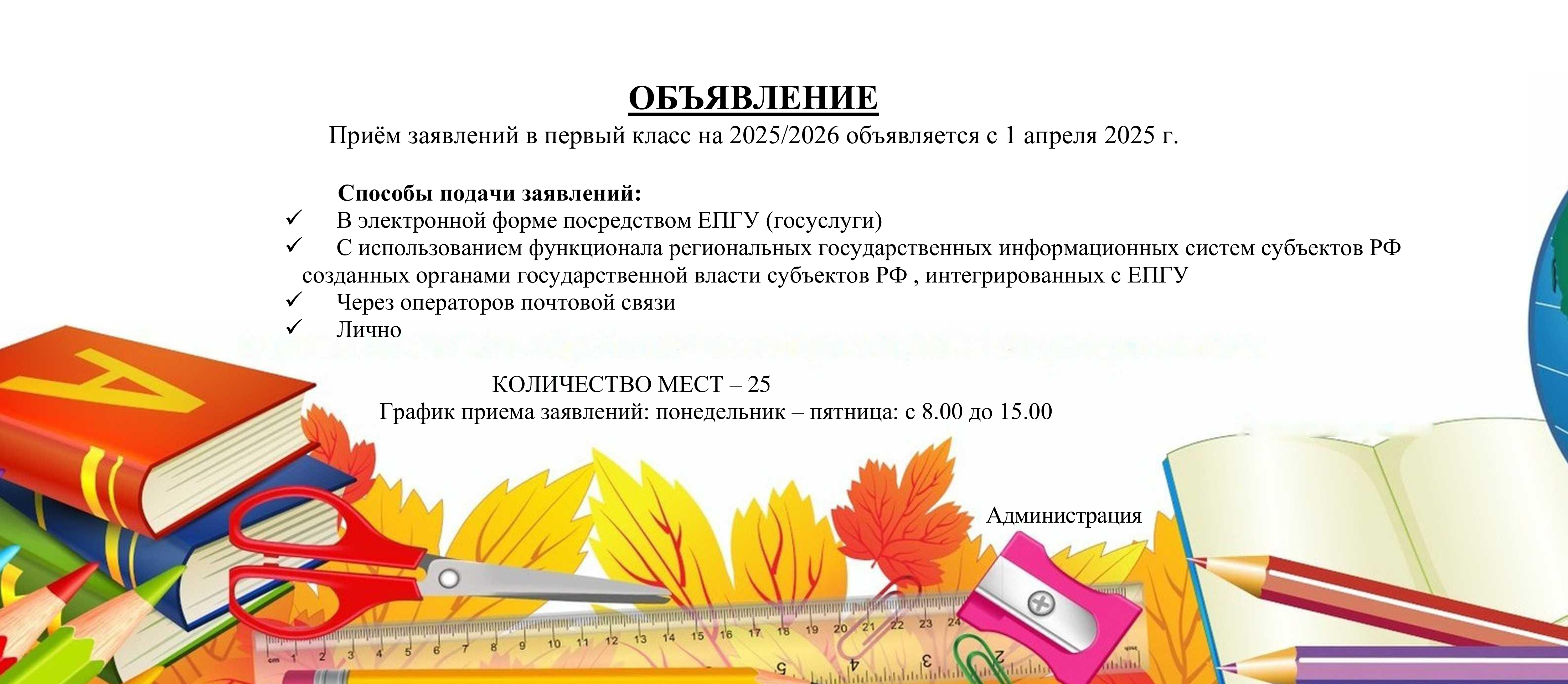 С 06 июля 2025 г. по 5 сентября 2025 г. — прием граждан на свободные места без регистрации.